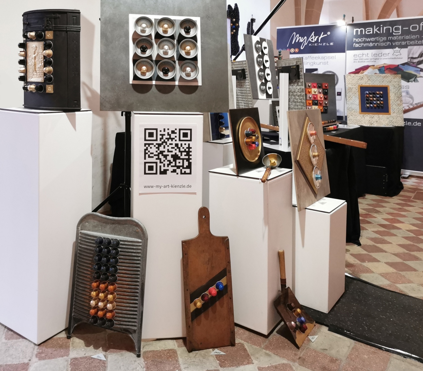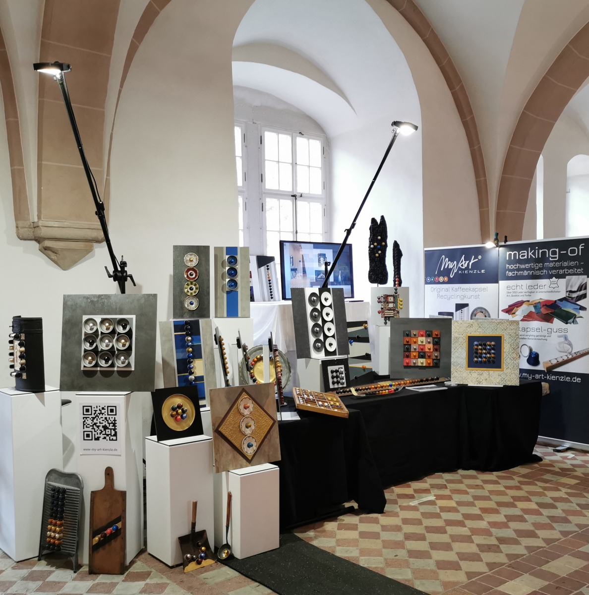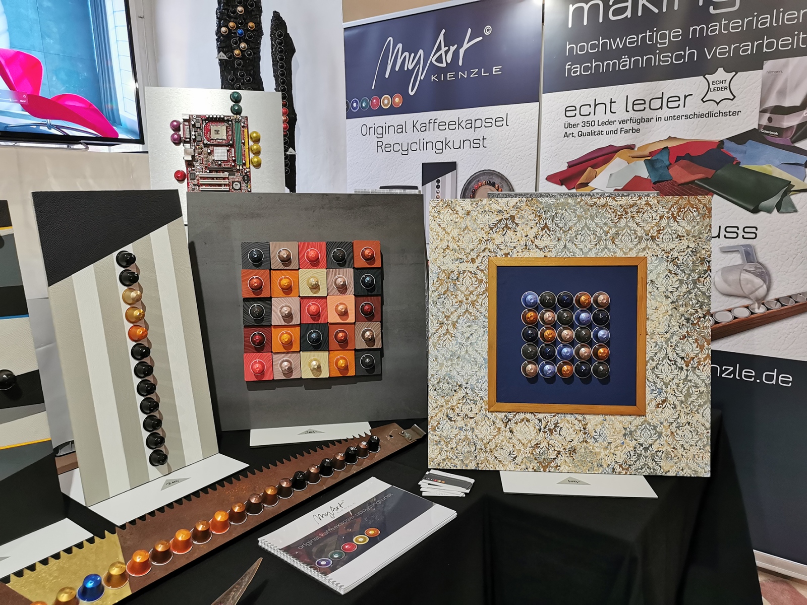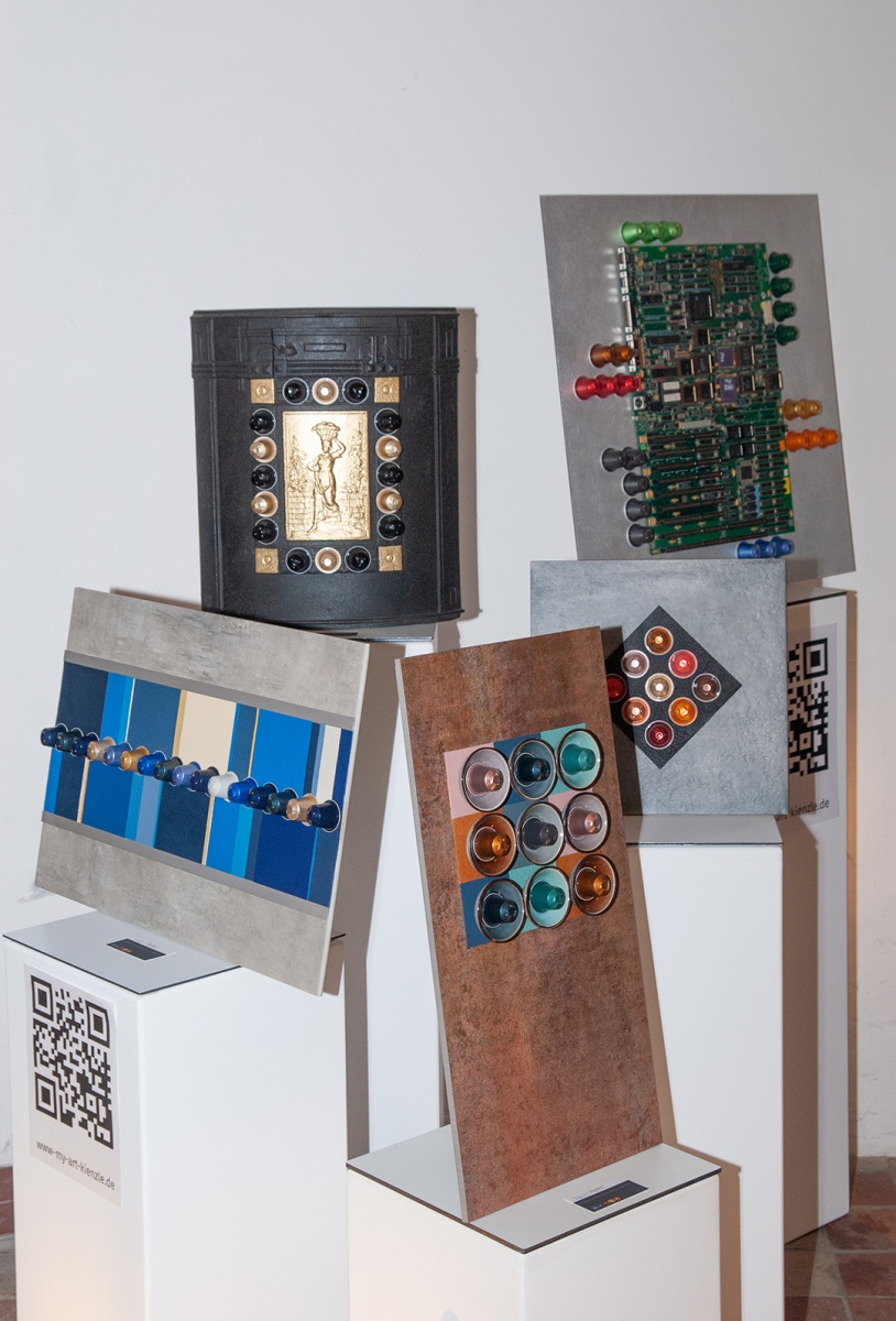 MY ART KIENZLE original kaffeekapsel upcyclingkunst AUSSTELLUNGENARTBOXY digitale Ausstellungen weltweit in verschiedenen Galerien ab April 2025SWISSARTEXPO Kunstmesse Zürich: August 2025FineArts, Kloster Eberbach: Oktober 2024FineArts, Kloster Eberbach: Oktober 2023FineArts, Kloster Eberbach: Oktober 2021FineArts, Kloster Eberbach: Oktober 2019Unique - Der Manufakturenmarkt, Kloster Eberbach: Juni 2019Kunsthandwerkermarkt Ettlingen: November 2017Austellung Gallery Reinert: Februar bis Mai 2017