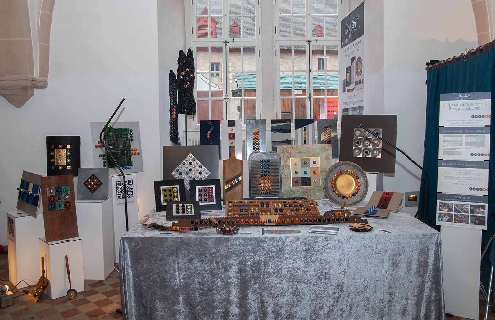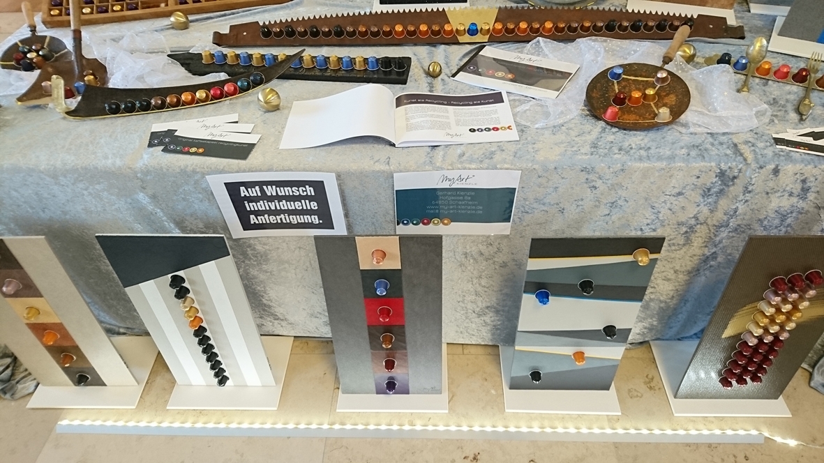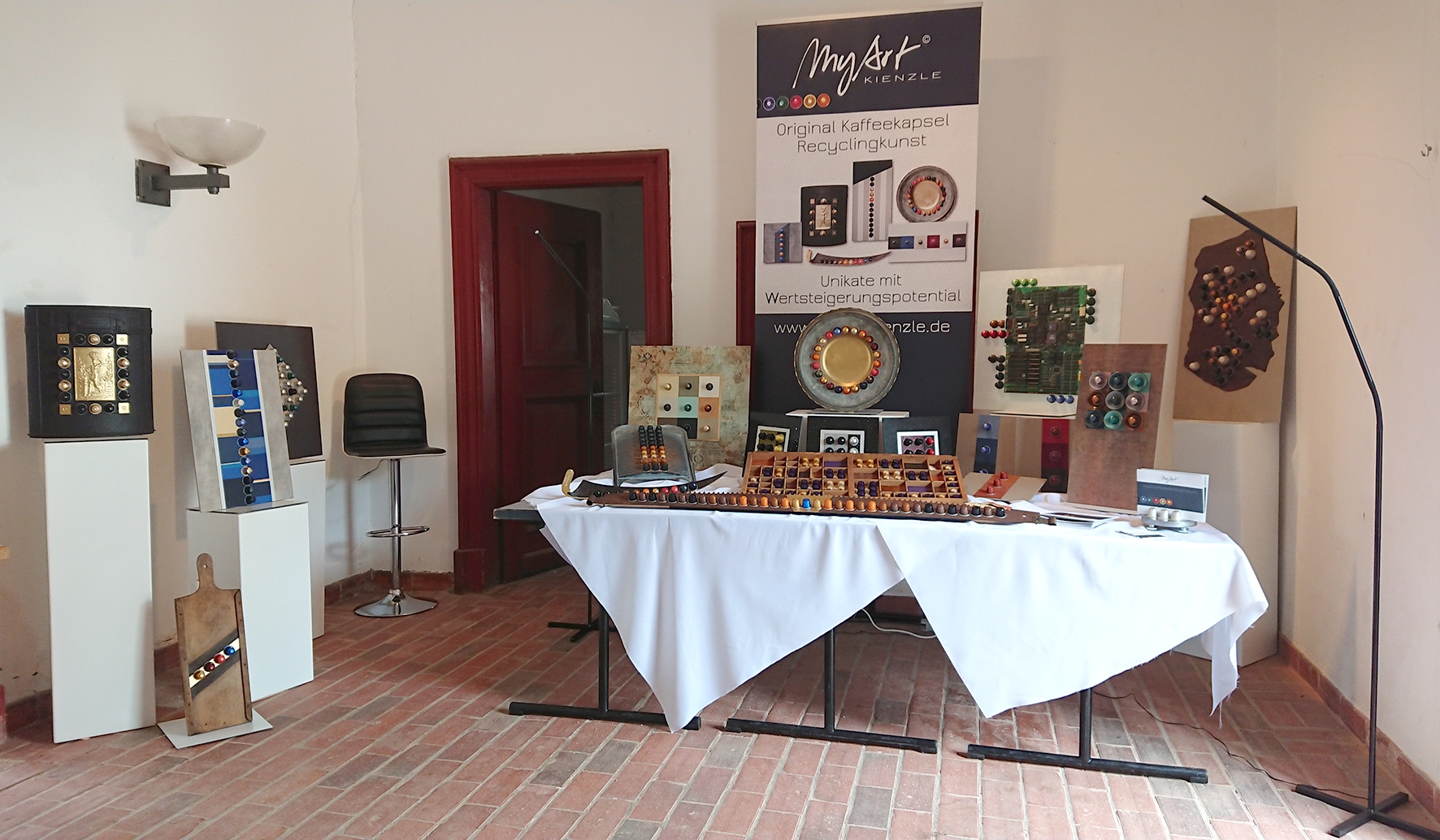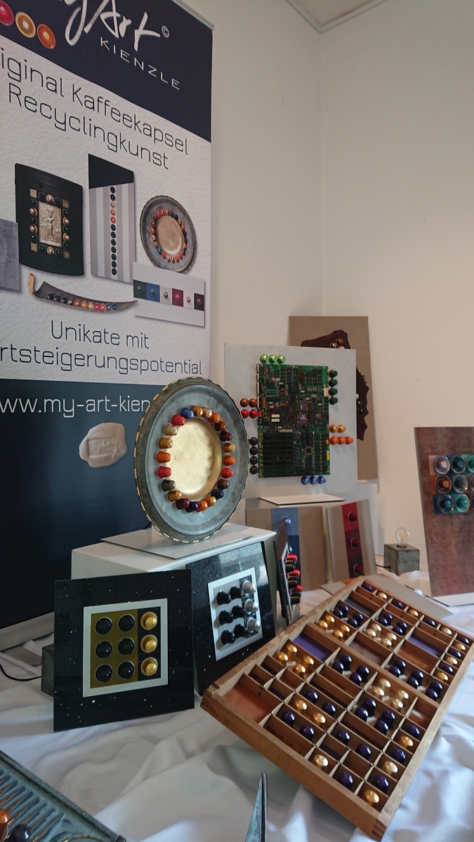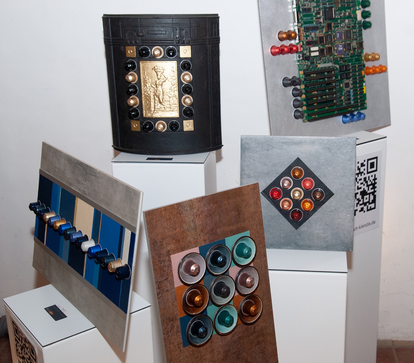 MY ART KIENZLE original kaffeekapsel upcyclingkunst AUSSTELLUNGENARTBOXY digitale Ausstellungen weltweit in verschiedenen Galerien ab April 2025SWISSARTEXPO Kunstmesse Zürich: August 2025FineArts, Kloster Eberbach: Oktober 2024FineArts, Kloster Eberbach: Oktober 2023FineArts, Kloster Eberbach: Oktober 2021FineArts, Kloster Eberbach: Oktober 2019Unique - Der Manufakturenmarkt, Kloster Eberbach: Juni 2019Kunsthandwerkermarkt Ettlingen: November 2017Austellung Gallery Reinert: Februar bis Mai 2017