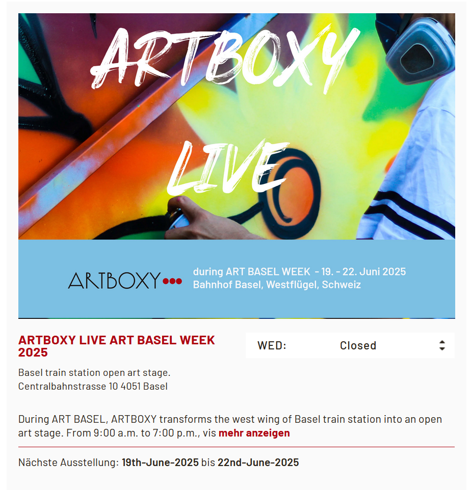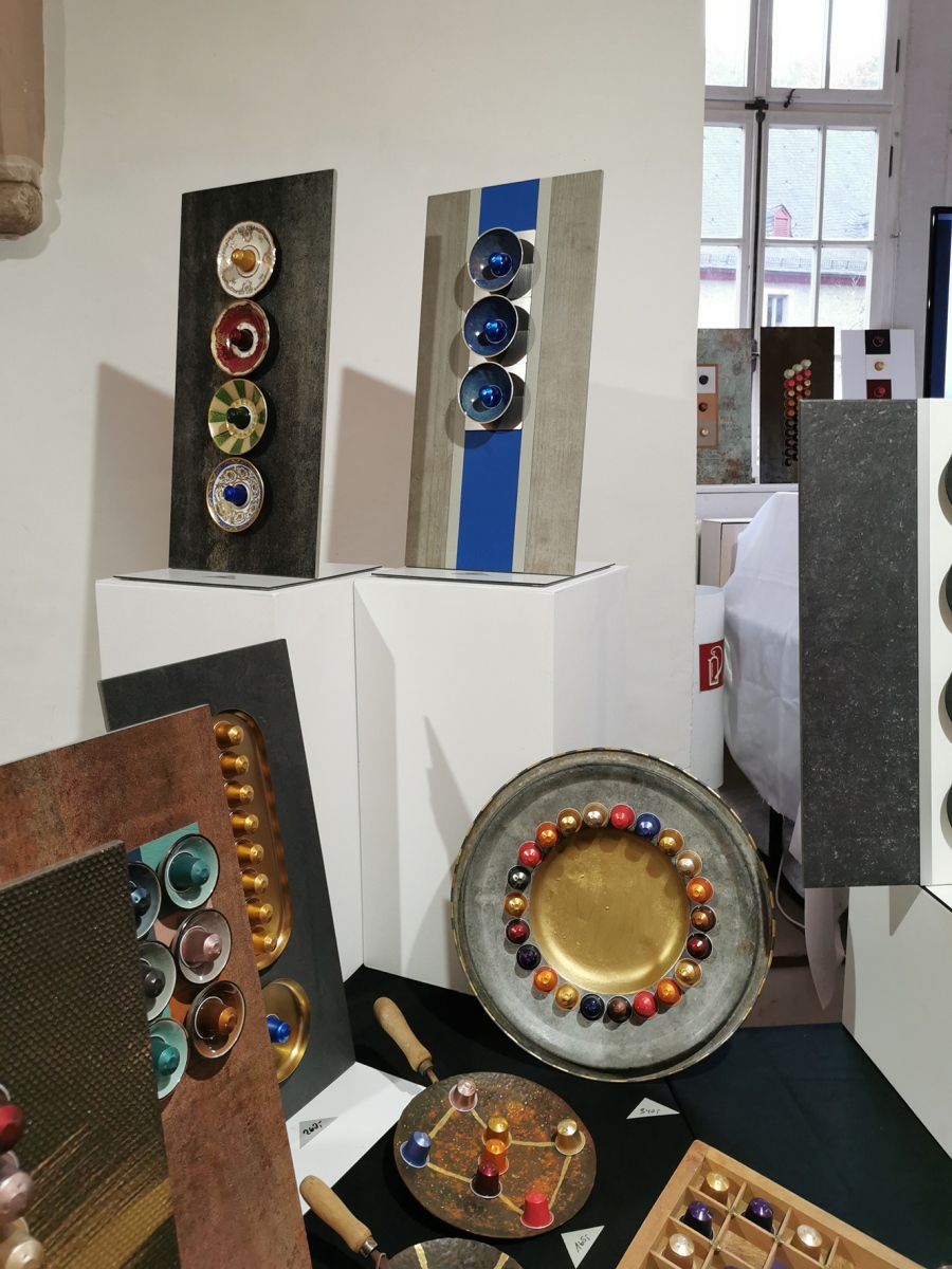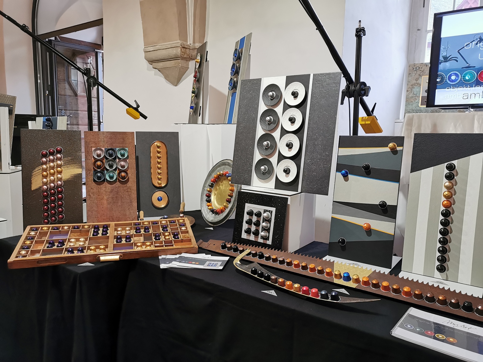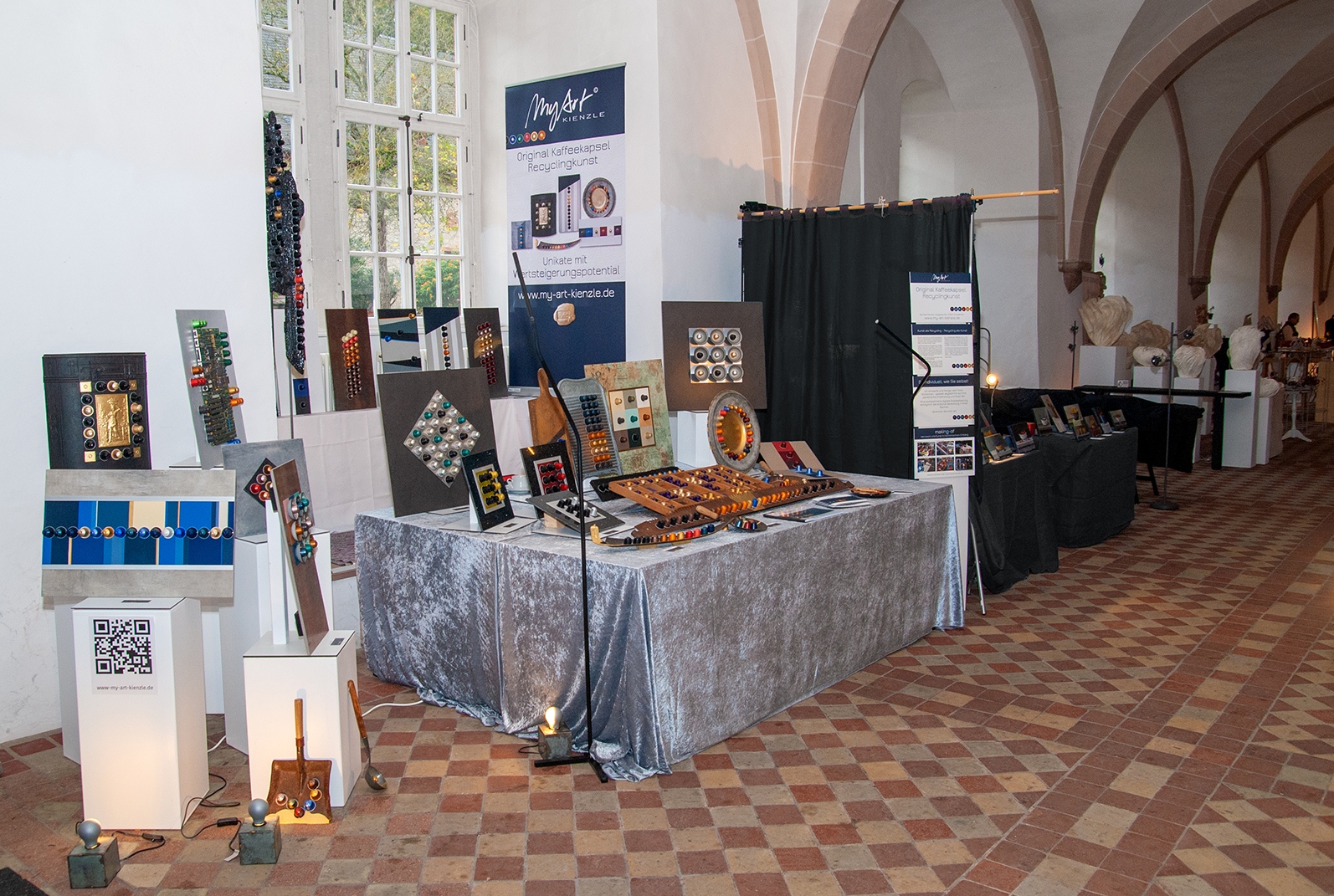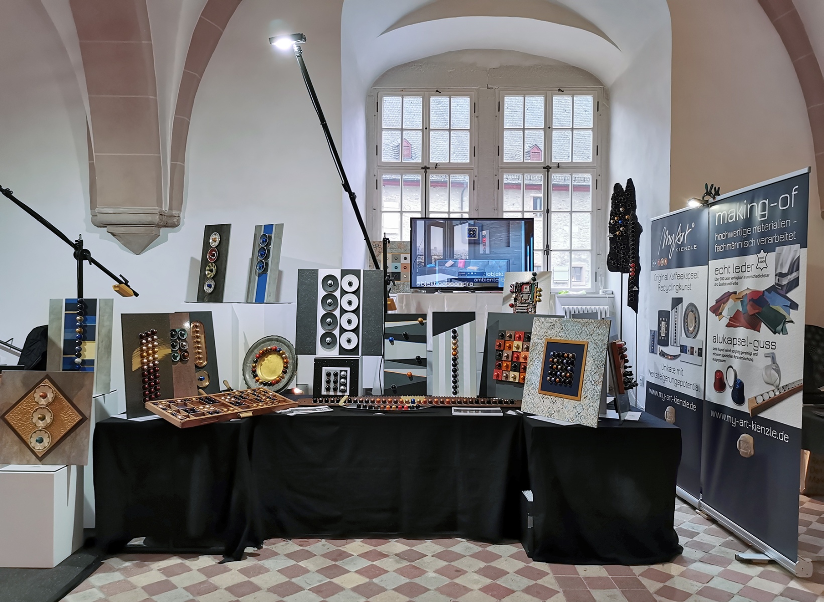 MY ART KIENZLE original kaffeekapsel upcyclingkunst AUSSTELLUNGENARTBOXY digitale Ausstellungen weltweit in verschiedenen Galerien ab April 2025SWISSARTEXPO Kunstmesse Zürich: August 2025FineArts, Kloster Eberbach: Oktober 2024FineArts, Kloster Eberbach: Oktober 2023FineArts, Kloster Eberbach: Oktober 2021FineArts, Kloster Eberbach: Oktober 2019Unique - Der Manufakturenmarkt, Kloster Eberbach: Juni 2019Kunsthandwerkermarkt Ettlingen: November 2017Austellung Gallery Reinert: Februar bis Mai 2017