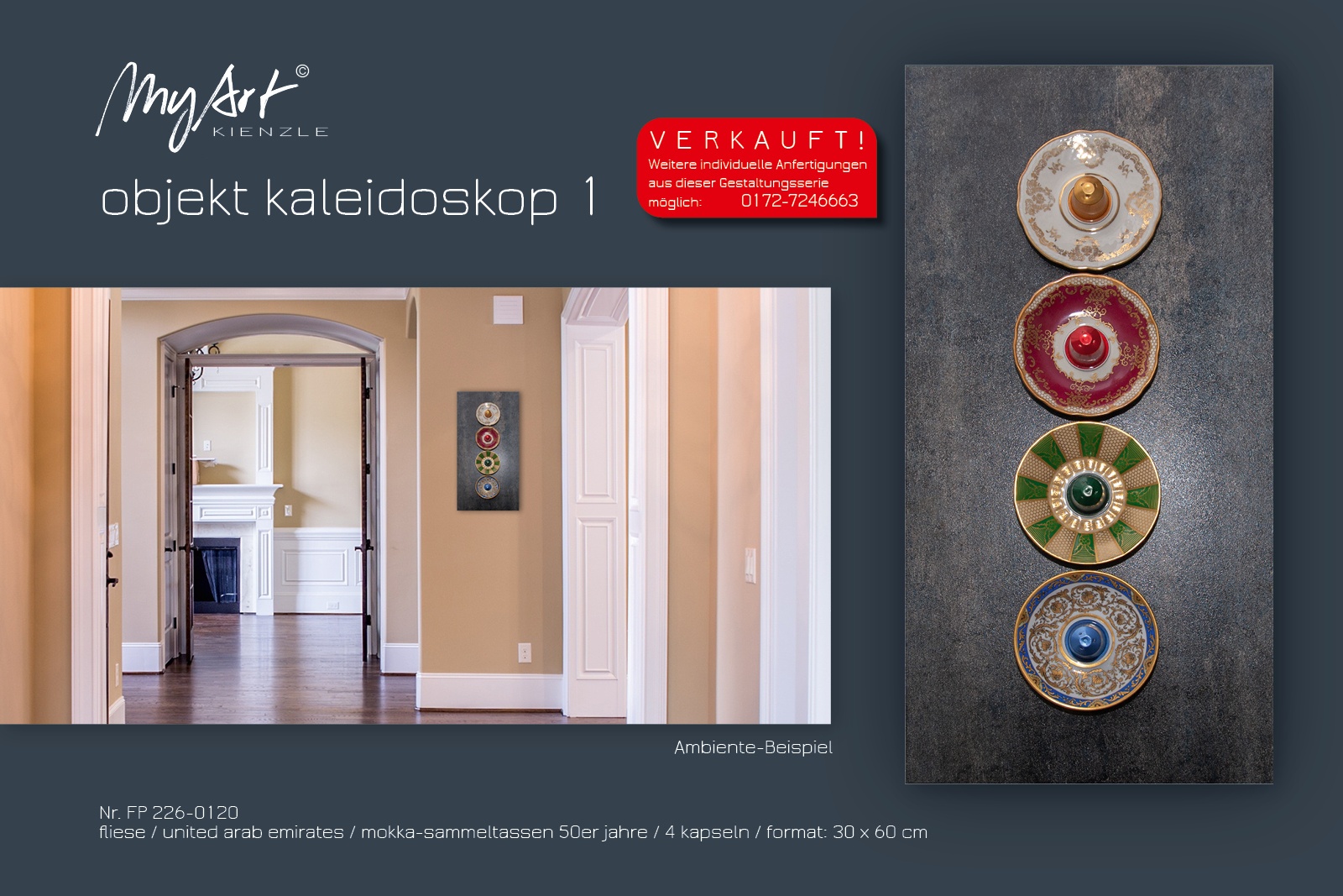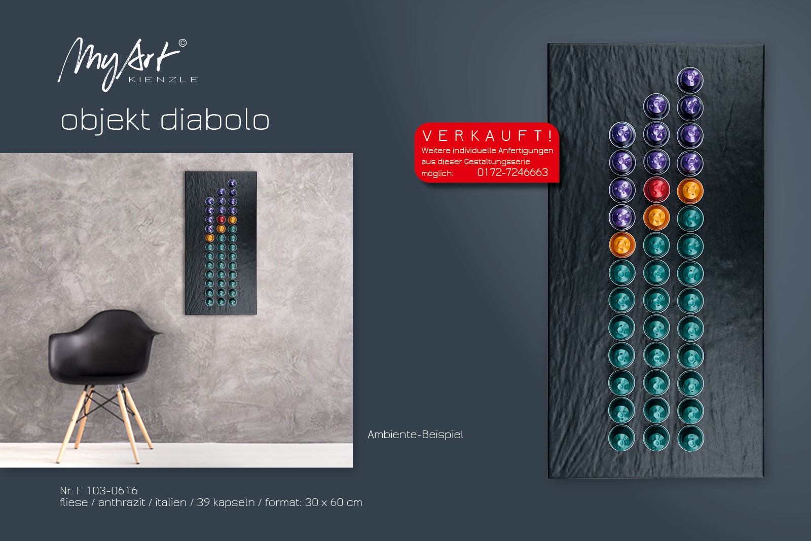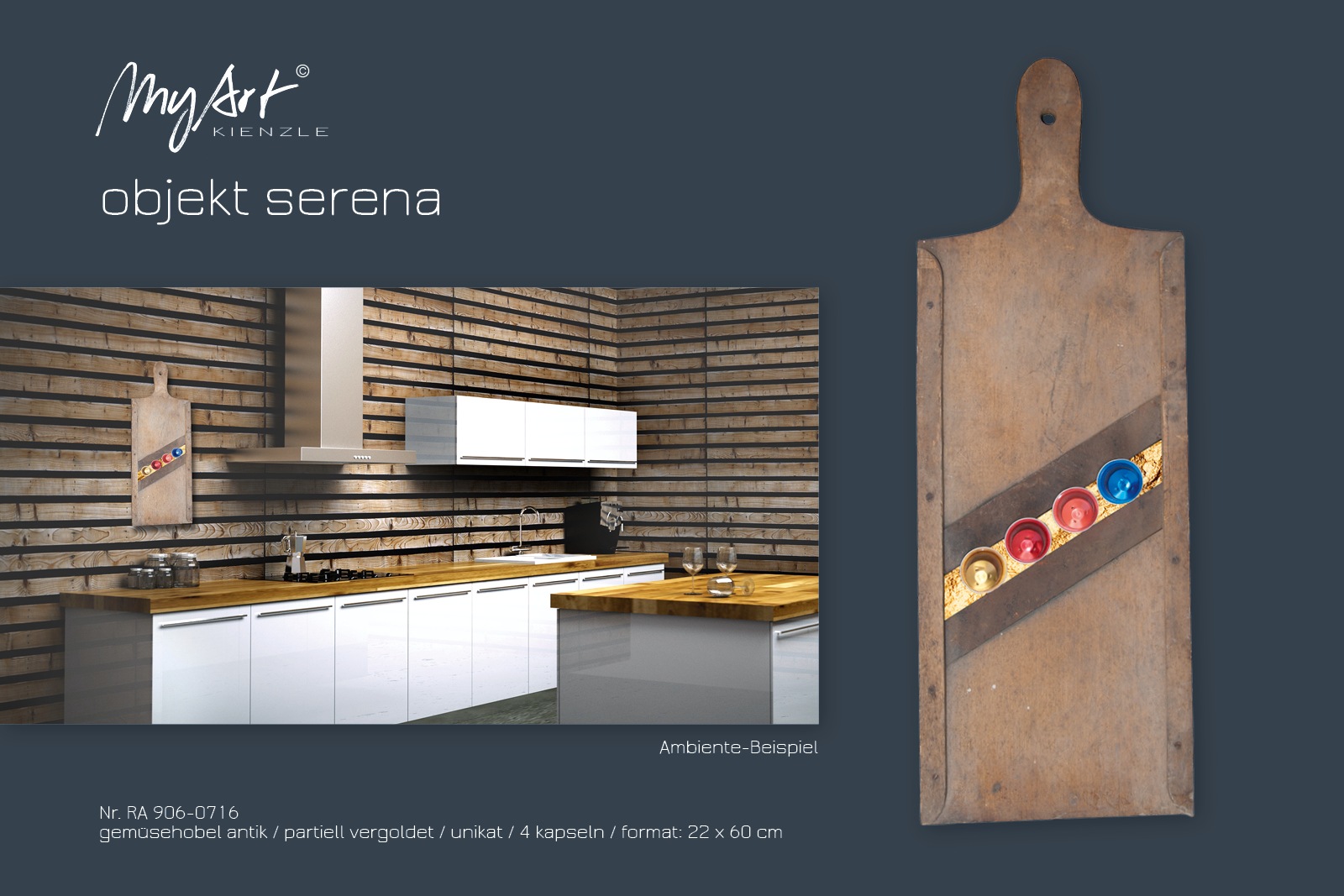 In the contrasting series of objects, an antique item forms a striking backdrop that tells its own unique story with clearly visible signs of wear. The coffee capsules provide a successful modern contrast. In some selected objects, I further emphasise the traces of the past with gold leaf, gold bronze or gold dust.