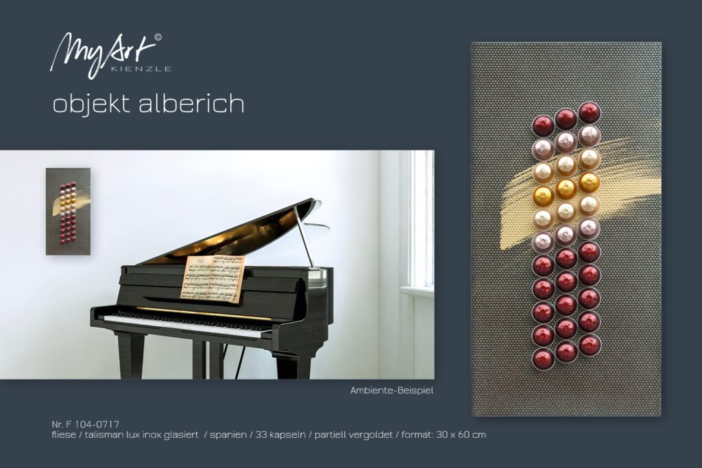 Kaffeekapsel-Upcycling. Fliese „talisman lux inox glasiert“, Goldbrush-Illustration und speziell bearbeiteten Nespressokapseln.
