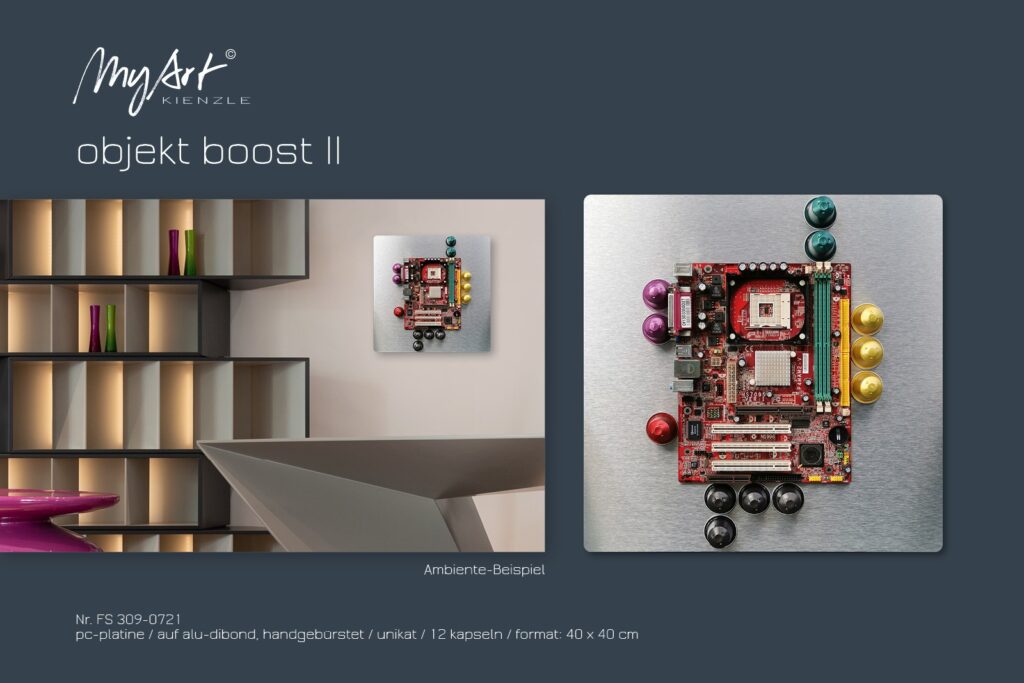 BOOST II zeigt die Vorderseite einer PC-Hauptplatine – dicht bestückt mit Transistoren, Prozessoren, Schnittstellen und Speicherbänken. Ihre technische Komplexität erinnert an eine Miniaturfabrik oder ein urbanes Präzisionskraftwerk. Außerhalb dieser „Maschine“ sind farblich gegliederte Nespresso-Kapseln in Gruppen angeordnet – wie Silos, Depots oder Tanks, die das System symbolisch mit Energie, Daten oder Ressourcen speisen. Das Werk spielt mit der Analogie von Konsum und Technik, von Kapsel und System, von Versorgung und Output – ein Bild für die Ästhetik des Alltäglichen im Zeitalter der Digitalisierung.