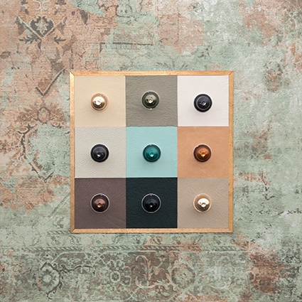 Kaffeekapsel-Upcycling. Collage auf Basisfliese mit Echtleder, Lindenleisten und speziell bearbeiteten Nespressokapseln.