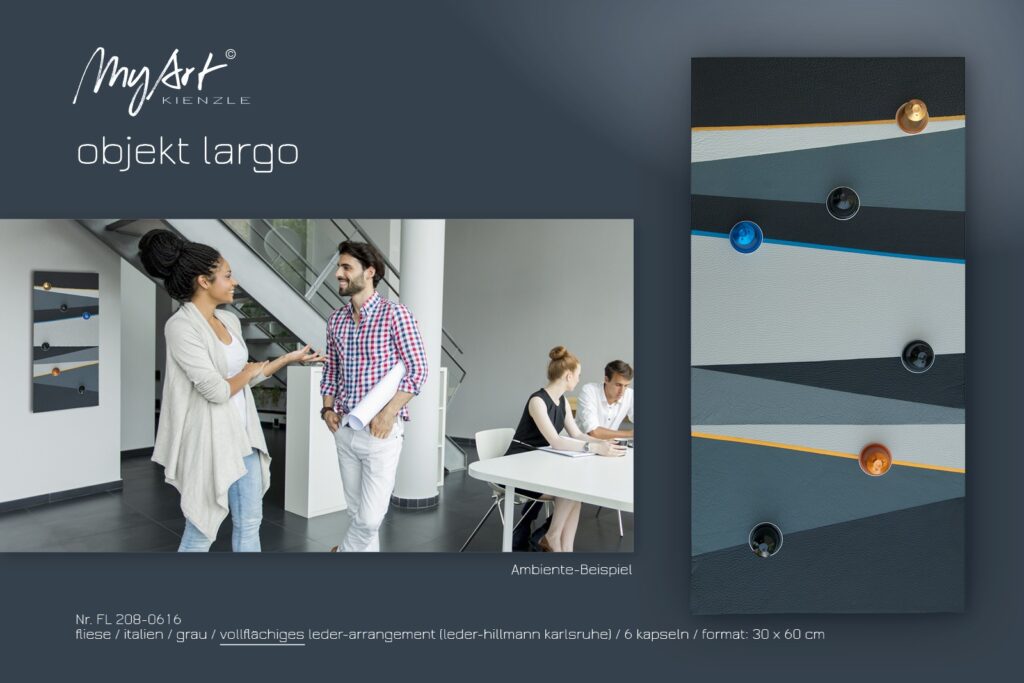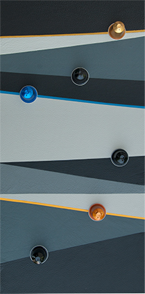 Largo entfaltet sich in einem vollflächigen Arrangement aus hochwertigem Leder – in feinen Abstufungen von Anthrazit, Schiefer, Taubengrau und Schwarz. Wie ein abstrahiertes Backgammon-Brett formen die schrägen Felder eine elegante Bühne, auf der sich das Geschehen scheinbar in Zeitlupe entfaltet. Die Kaffeekapseln erinnern an Spielsteine: Sie markieren Zwischenräume, Übergänge – vielleicht Entscheidungen. Feine Linien in Blau und Gelb durchbrechen die strenge Ruhe und setzen gezielte Impulse – wie das Ausspielen eines mutigen Zugs.