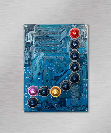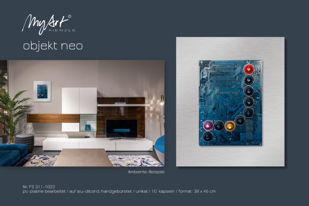 Kaffeekapsel-Upcycling. Collage auf Alu-Dibondplatte, blaue Leiterplatte und speziell bearbeiteten Nespressokapseln.
