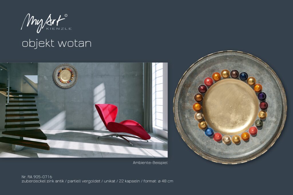 Das Zentrum von WOTAN bildet der verzinkte Deckel eines alten Waschzubers – ein Fundstück aus vergangener Alltagskultur, rau und authentisch. Seine Zeitspuren und das matte Metall kontrastieren mit einem goldenen Kreis im Inneren, der dem Objekt eine fast kultische Präsenz verleiht. Darum legt sich ein Ring aus farbigen Kaffeekapseln – in Bronze, Blau, Rot, Violett und Gold. Ein strahlendes Spektrum industrieller Farbwelten trifft auf die schlichte Würde des alten Materials. WOTAN erzählt von Wandel und Wiederentdeckung – ein Objekt zwischen Ritual und Recycling, zwischen Gebrauchsgegenstand und Kunstsymbol. Unverwechselbar. Einzigartig.